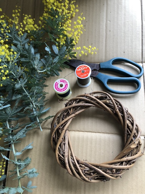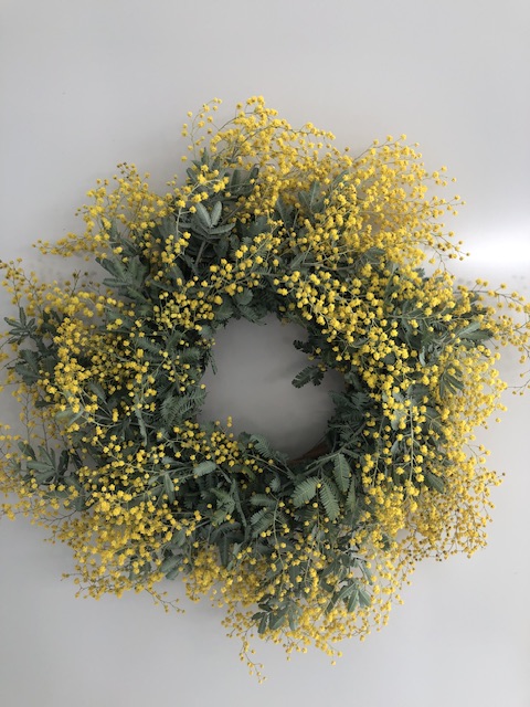 ②リースを正面に向けて、上にミモザの根元を固定し(ミモザの花がリースの外に出る様に配置する)糸を3回きつく巻く。結ばなくても大丈夫d( ̄  ̄)