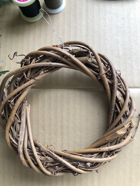 花は避けて枝とリースを密着し巻き付ける様に。(この画像のはゆる過ぎて後から取れてしまいやり直しました(;´д`)